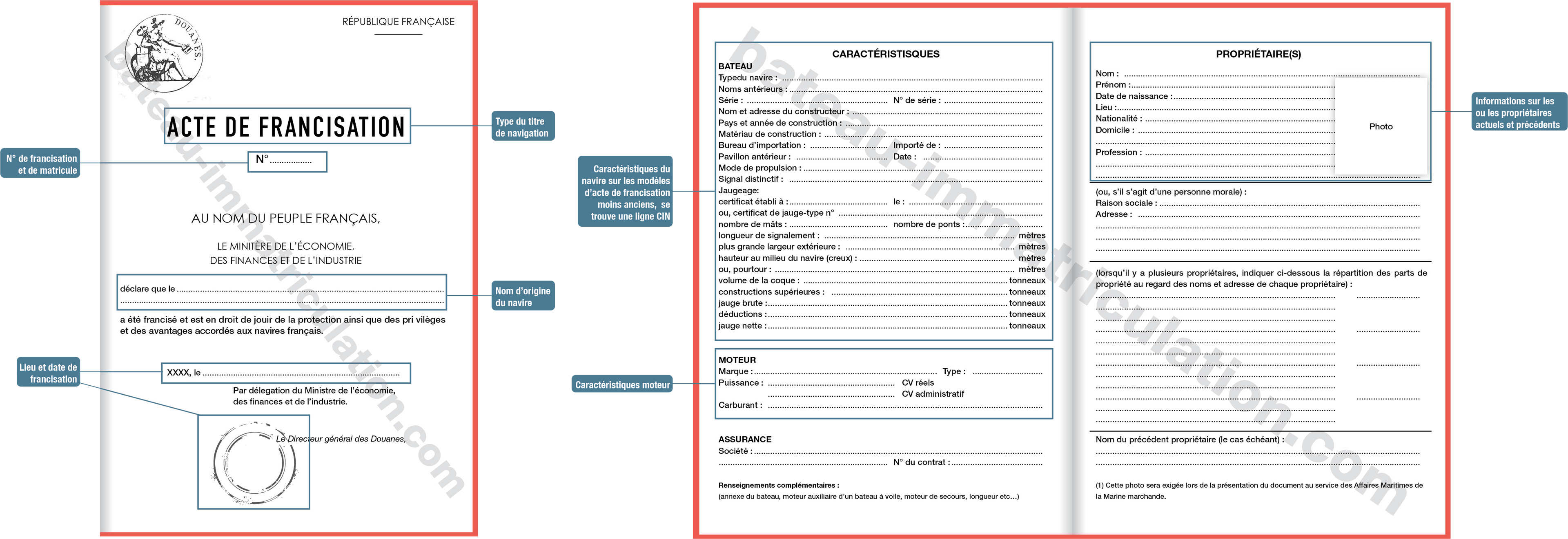 L’acte de francisation, valable toute la durée de vie du bateau tant qu’il bat pavillon français, est attaché au bateau et à son propriétaire. Tout changement (mutation de propriété, changement de situation administrative, remplacement de moteur, modification de la longueur de coque…) doit être porté à la connaissance du Bureau des Douanes.