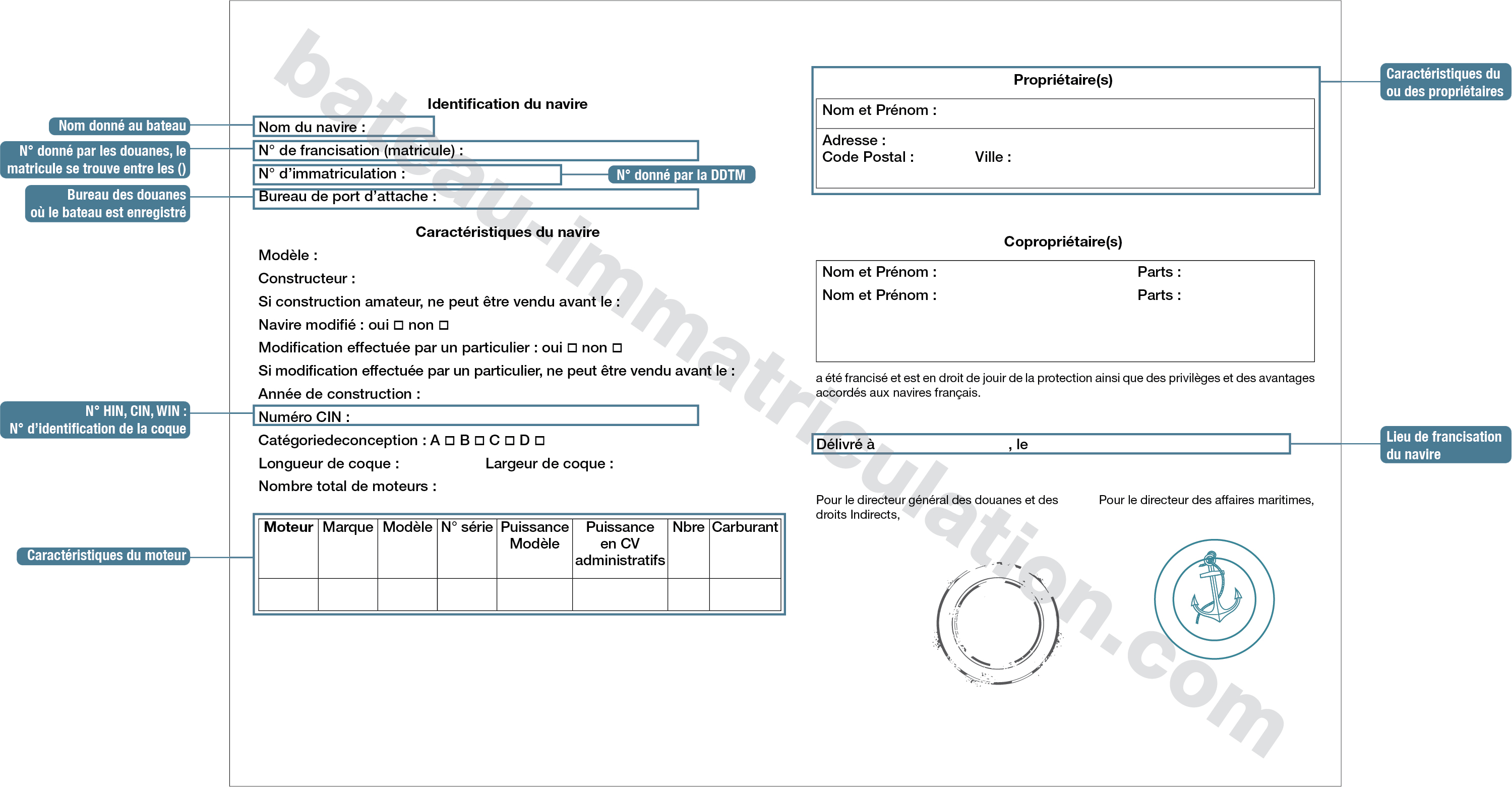 - Numéro d’immatriculation du bateau, donné par la DDTM (les deux premières lettres correspondent au quartier d’immatriculation et sont suivies de 6 chiffres et d’une lettre-clé. S’il y a changement de propriétaire ET de port d’attache, seules les deux premières lettres seront modifiées lors de la déclaration de mutation de propriété)